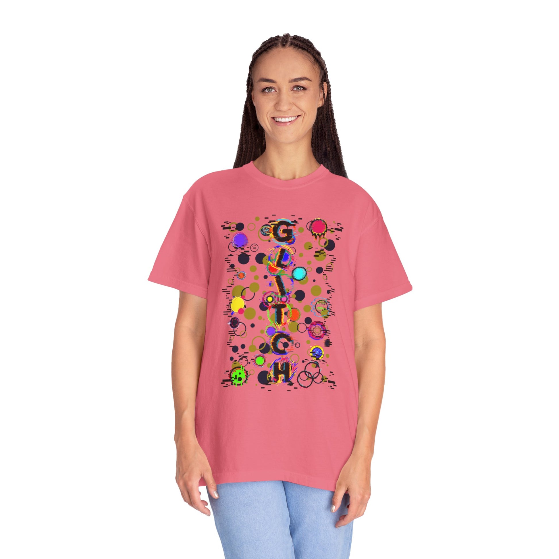 Vibrant and Eye-catching, this Comfort Colors Unisex T-shirt features a Bold, Colorful Glitch word pattern that adds a fun and unique touch to any outfit. It is perfect for those who love to stand out and express their personality through clothing. It is ideal for casual wear, parties, and music festivals.